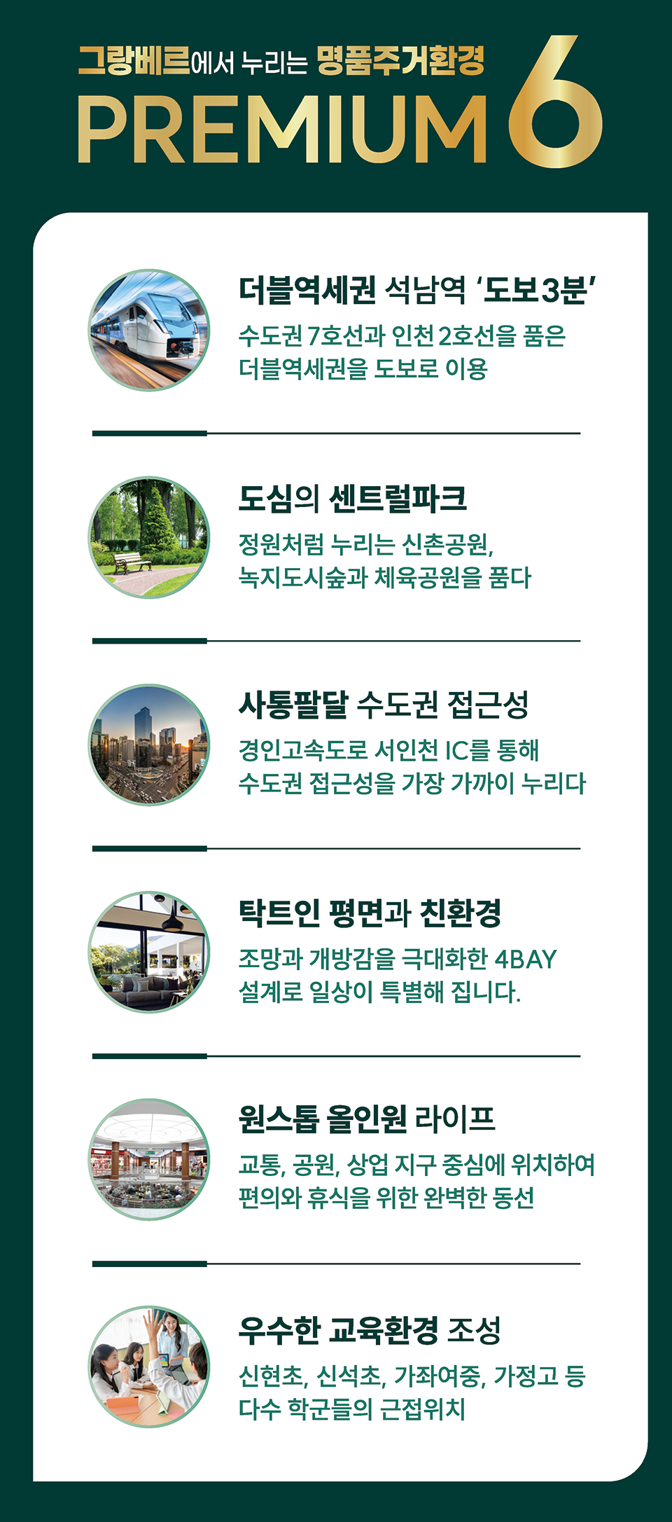 관심고객등록 약관 - 개인정보 수집 주체 : 석남역 센트럴파크 분양영업부 - 개인정보 수집 항목 : 성함,연락처 ■ 개인정보 수집, 이용, 위탁, 양도 동의 석남역 센트럴파크 그랑베르 분양영업부는 고객님의 원활한 서비스 이용을 위해 필요한 최소한의 개인정보를 수집하고 있습니다. 개인정보 제공받는 자 : 석남역 센트럴파크 그랑베르 분양영업부 직방, 호갱노노는 고객님의 개인정보를 수집하거나 분양상담에 직접 관여하지 않습니다. 광고 제공을 위한 개인정보 수집 및 이용은 광고주가 직접 진행하며, 직방/호갱노노는 개인정보 수집 및 이용에 관여하거나 광고 내용의 정확성을 보증하지 않습니다. 정보의 정확성이나 신뢰성을 보증하지 않으며, 서비스 이용의 결과에 대해서 어떠한 법적인 책임을 지지 않습니다. 고객님은 개인정보 수집에 동의하지 않을 권리가 있습니다. 다만, 필수 항목에 대한 동의를 거부하실 경우 관심고객 등록이 불가능합니다. 1. 수집하는 개인정보 항목 관심고객 등록을 통해 다음과 같은 개인정보를 수집합니다. 개인정보 제공 필수 항목 : 이름, 휴대전화번호 개인정보 제공 선택 항목 : 주소 (시/도, 시/군/구), 관심 타입, 연령대 2. 개인정보의 수집 및 이용 목적 수집된 개인정보는 다음의 목적으로 이용됩니다. 이름, 휴대전화번호 : 분양 정보 안내, 상담, 고지사항 전달, 불만 처리, 이벤트 정보 제공 관심 타입: 맞춤형 정보 제공 연령대: 통계 분석 및 맞춤형 서비스 제공 3. 개인정보의 보유 및 이용 기간 수집된 개인정보는 원칙적으로 관심고객 등록 시점부터 분양 완료 시까지 보유 및 이용합니다. 단, 마케팅 활용 동의 시에는 별도의 보유 기간을 따릅니다. 파기 절차: 분양 완료 후 별도 DB로 이관하여 일정 기간 보관 후 파기 파기 방법: 전자적 파일 형태의 정보는 복구 불가능한 기술적 방법을 사용하여 영구 삭제하며, 종이 문서 형태의 정보는 분쇄하거나 소각합니다.
